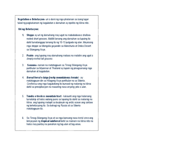 Kalupaang Asyano ay kinabibilangan ng Cambodia Laos Myanmar Thailand at ang Vietnam. Ang mga Makikitang Lugar sa Asya Ay matatagpuan SA Limang Rehiyon Na Ito Timog AsyaSilangang Asya TIMOG ASYATIMOG KANLURANG ASYAAT HILAGA. Kinapapalooban ito ng mga elemento tulad ng temperatura ulan at hangin.
