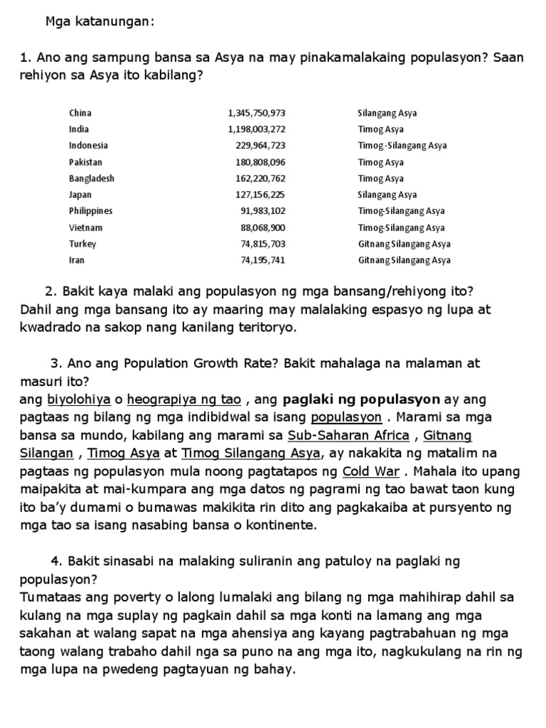 1 question Anong ang 10 bansa sa Asya na May pinakamalalang populasyon. Taya ng Nagkakaisang Bansa 47 North Korea. Saang rehiyon ng Asya kabilang ang mga itoHalimbawa.