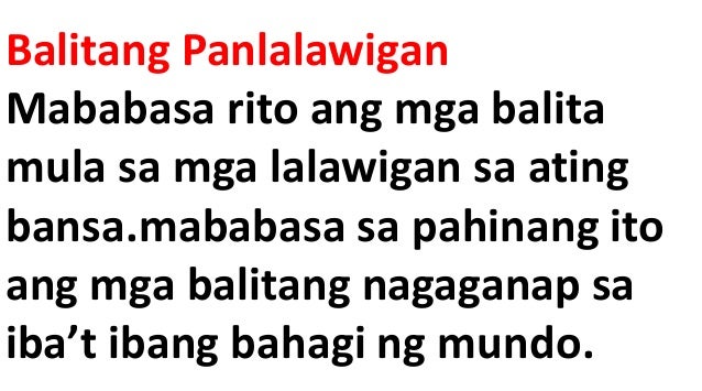 Subscribe to our official YouTube channel. Balitang pambansa- mga balitang pumapaloob lang sa isang lugar o bansa at hindi sa ibang lugar. Balitang Pang-ibang Bansa 15.