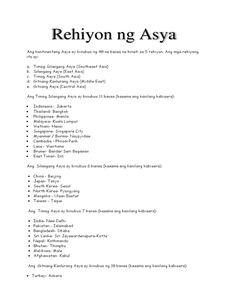 Alamin ang ibat ibang mga rehiyon sa Asya at mga bansa nito sa tulong ng isinulat naming blog. Indianisasyon ng tsa indiyanisasyon - paglalarawan sa kolonisasyong kultural sa tsa ng mga indian naganap bunsod ng unang pandarayuhan ng mga mangangalakal misyonerong buddhist at hindu 3. Ito ay isang talaan ng mga kabisera ng Silangan Timog at Timog Silangang Asya.